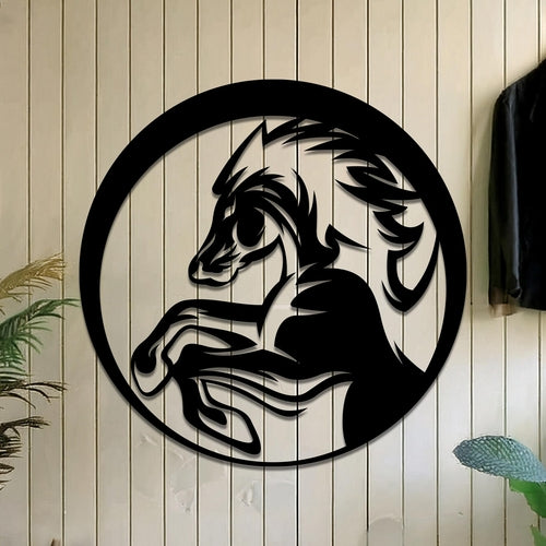This Horse Sign is a versatile decor piece suitable for both indoor and outdoor use. Crafted from 16-gauge steel, it is designed to withstand the elements while maintaining its integrity. The sign is coated with premium-grade paint, ensuring durability and longevity in any setting.